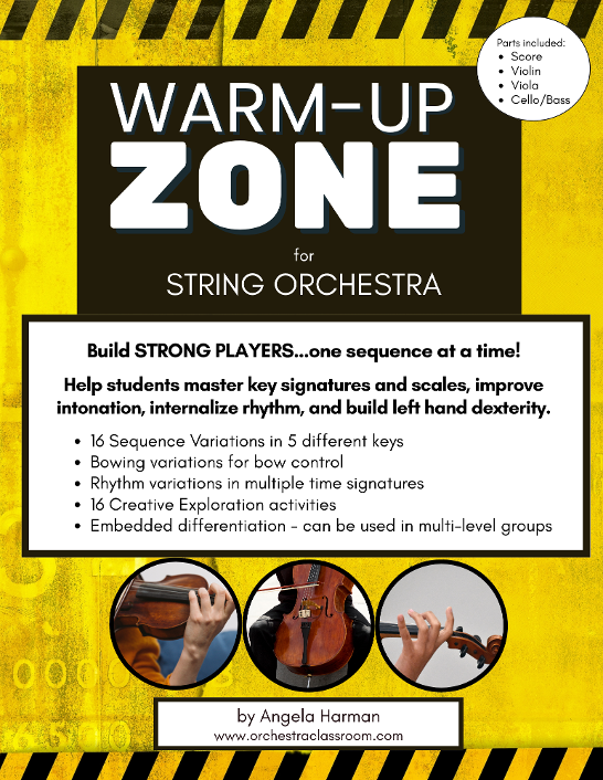 This warm up book is perfect for many skill levels. There are ways to differentiate each exercise so all students can succeed as they master scales, fingerings, intonation, bowing, time signatures, and key signatures from 2 sharps to 2 flats.